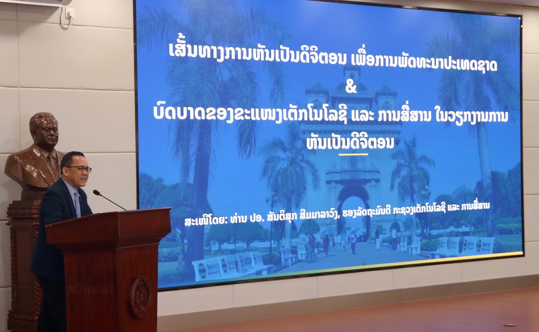 ໃນວາລະດັ່ງກ່າວ, ທ່ານ ປອ. ສັນຕິສຸກ ສິມມາລາວົງ, ຮອງລັດຖະມົນຕີ ກະຊວງເຕັກໂນໂລຊີ ແລະ ການສື່ສານ ໄດ້ຂຶ້ນນໍາສະເໜີ ກ່ຽວກັບ ເສັ້ນທາງການຫັນເປັນດິຈິຕອນ ເພື່ອການພັດທະນາປະເທດຊາດ ແລະ ບົດບາດຂອງຂະແໜງເຕັກໂນໂລຊີ ແລະ ການສື່ສານ ໃນວຽກງານການຫັນເປັນດິຈິຕອນ, ວິໄສທັດການພັດທະນາເສດຖະກິດດິຈິຕອນແຫ່ງຊາດ ໄລຍະ 20 ປີ (2021-2040), ຍຸດທະສາດການພັດທະນາເສດຖະກິດດິຈິຕອນ ແຫ່ງຊາດ ໄລຍະ 10 ປີ (2021-2030), ແຜນພັດທະນາເສດຖະກິດດິຈິຕອນ ແຫ່ງຊາດ ໄລຍະ 05 ປີ (2021-2025) ແລະ ແຜນພັດທະນາເຕັກໂນໂລຊີ ແລະ ການສື່ສານ 05 ປີ ຄັ້ງທີ IV (2026-2030). ຊຸດຝຶກອົບຮົມຄັ້ງນີ້ ຈະໄດ້ດໍາເນີນໄປເປັນເວລາ 4 ວັນ (15-18 ທັນວາ 2025), ຊຶ່ງຜູ້ເຂົ້າຮ່ວມຈະໄດ້ຮັບຟັງການນໍາສະເໜີຫຼາຍຫົວຂໍ້ທີ່ສໍາຄັນຈາກບັນດາຫົວໜ້າກົມ, ສູນ, ອົງການ ແລະ ສະຖາບັນ ພາຍໃນກະຊວງ ເຊັ່ນ: ການຄຸ້ມຄອງ ວຽກງານເຕັກໂນໂລຊີ ແລະ ນະວັດຕະກໍາ, ພາບລວມການນໍາໃຊ້ເຕັກໂນໂລຊີການສື່ສານຂໍ້ມູນຂ່າວສານ, ຄວາມຮູ້ພື້ນຖານການບໍລິຫານ ແລະ ບໍລິການລັດດິຈິຕອນ, ບົດບາດເສດຖະກິດດິຈິຕອນ ແລະ ທຸລະກໍາຊັບສິນດິຈິຕອນ, ວຽກງານຄວາມປອດໄພໄຊເບີ, ເຕັກໂນໂລຊີດິຈິຕອນ ແລະ ເຕັກໂນໂລຊີອັດສະລິຍະ, ການຄຸ້ມຄອງ ແລະ ພັດທະນາເຕັກໂນໂລຊີໂລຈີສຕິກ ແລະ ການໄປສະນີ, ວຽກງານຫັນຫ້ອງການເປັນດິຈິຕອນ, ດໍາລັດວ່າດ້ວຍກອງທຶນພັດທະນາໂທລະຄົມມະນາຄົມ ແລະ ການຫັນເປັນດິຈິຕອນ, ການຫັນເປັນດິຈິຕອນ ແລະ ວຽກງານຄະນະກໍາມະການຄຸ້ມຄອງອິນເຕີເນັດຂັ້ນແຂວງ, ອິນເຕີເນັດ ແລະ ສື່ສັງຄົມອອນລາຍ ແລະ ຫົວຂໍ້ອື່ນໆອີກ. ນອກຈາກນັ້ນ, ຍັງຈະໄດ້ຮັບຟັງການສົນທະນາແລກປ່ຽນ ຖາມ-ຕອບ ແກ້ຂໍ້ຂ້ອງໃຈໃນແຕ່ລະຫົວຂໍ້ ແລະ ທັດສະນະຢ້ຽມຢາມສະຖານທີ່ປະຕິບັດງານ ແລະ ຫ້ອງເຕັກນິກຕ່າງໆພາຍໃນກະຊວງ ເຊັ່ນ: ສູນອິນເຕີເນັດແຫ່ງຊາດ, ສູນຮັກສາຄວາມປອດໄພໄຊເບີ, ສວນອຸທິຍານດິຈິຕອນ, ກົມຄື້ນຄວາມຖີ່ວິທະຍຸສື່ສານ ແລະ ສູນຂໍ້ມູນແຫ່ງຊາດ ເປັນຕົ້ນ.