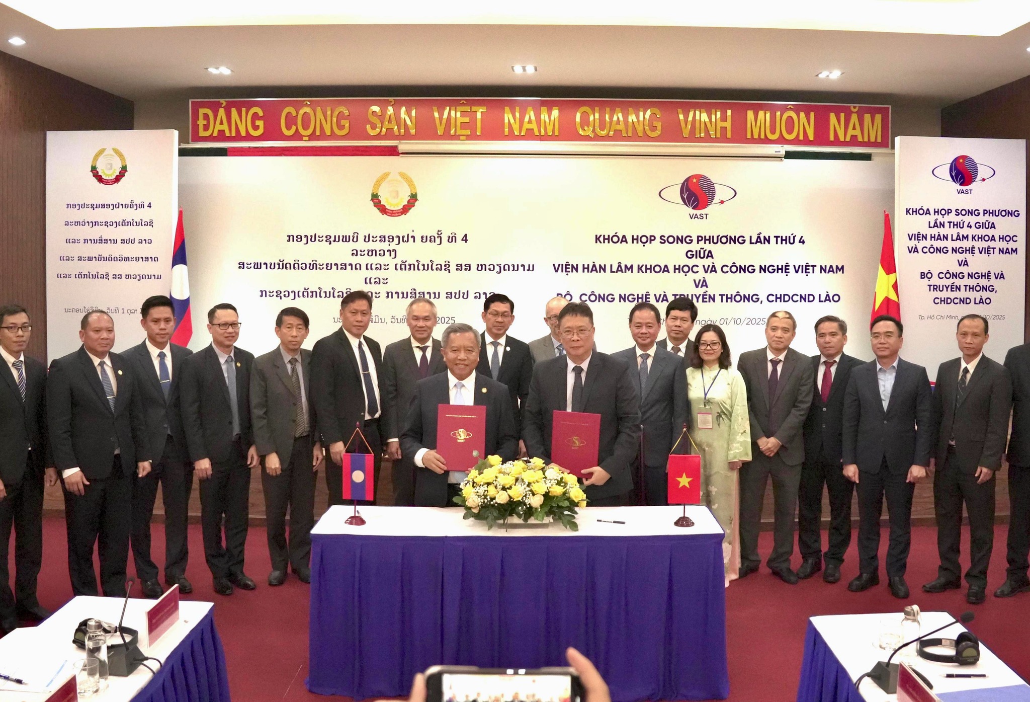 ໂດຍຕອບສະໜອງຕາມການເຊື້ອເຊີນ ຂອງ ທ່ານ ບັນດິດ ສຈ. ເຈົາ ວັນ ມິງ, ປະທານສະພາບັນດິດ ວິທະຍາສາດ ແລະ ເຕັກໂນໂລຊີ ສສ ຫວຽດນາມ, ໃນວັນທີ 01 ຕຸລາ 2025 ທີ່ຜ່ານມາ, ຄະນະຜູ້ແທນ ກະຊວງເຕັກໂນໂລຊີ ແລະ ການສື່ສານ ສປປ ລາວ ນໍາໂດຍ ທ່ານ ບັນດິດ ສຈ. ບໍ່ວຽງຄຳ ວົງດາລາ, ລັດຖະມົນຕີ ກະຊວງເຕັກໂນໂລຊີ ແລະ ການສື່ສານ ສປປ ລາວ ພ້ອມດ້ວຍຄະນະ ໄດ້ເດີນທາງໄປເຄື່ອນໄຫວວຽກວຽກງານ ທີ່ ນະຄອນໂຮຈິມິນ, ສສ ຫວຽດນາມ, ຊຶ່ງໃນໂອກາດດັ່ງກ່າວ ກໍໄດ້ເຂົ້າຮ່ວມກອງປະຊຸມພົບປະສອງຝ່າຍ ຄັ້ງທີ 4. ກອງປະຊຸມຄັ້ງນີ້ ໄດ້ທົບທວນຄືນໝາກຜົນຂອງການຮ່ວມມືໄລຍະຜ່ານມາ, ພ້ອມທັງໄດ້ຕີລາຄາໃນການຮ່ວມມືສອງຝ່າຍມີຜົນສຳເລັດຫຼາຍດ້ານ ເປັນຕົ້ນແມ່ນ ການຮ່ວມມືໃນວຽກງານຫ້ອງທົດລອງ ດ້ານຂໍ້ມູນຂ່າວສານ ແລະ ການສື່ສານ ກ່ຽວກັບໄພພິບັດ (ແຜ່ນດິນໄຫວ ແລະ ອື່ນໆ), ໄດ້ມີການຈັດຝຶກອົບຮົມໄລຍະສັ້ນ ແລະ ການກໍ່ສ້າງບຸກຄະລາກອນໄລຍະຍາວ ເພື່ອສ້າງຄວາມເຂັ້ມແຂງດ້ານຊັບພະຍາກອນມະນຸດ, ສ້າງຄວາມເຂັ້ມແຂງດ້ານການຕີລາຄາ, ກວດສອບ, ປະເມີນການນຳໃຊ້ ເເລະ ການຖ່າຍທອດເຕັກໂນໂລຊີລະດັບສູງ ໃຫ້ແກ່ພະນັກງານຂອງ ກະຊວງເຕັກໂນໂລຊີ ແລະ ການສື່ສານ, ພ້ອມກັນນັ້ນ ຍັງໄດ້ມີການຮ່ວມມືສອງຝ່າຍໃນຂົງເຂດວິທະຍາສາດ, ເຕັກໂນໂລຊີດິຈິຕອນ ແລະ ນະວັດຕະກໍາອື່ນໆ.